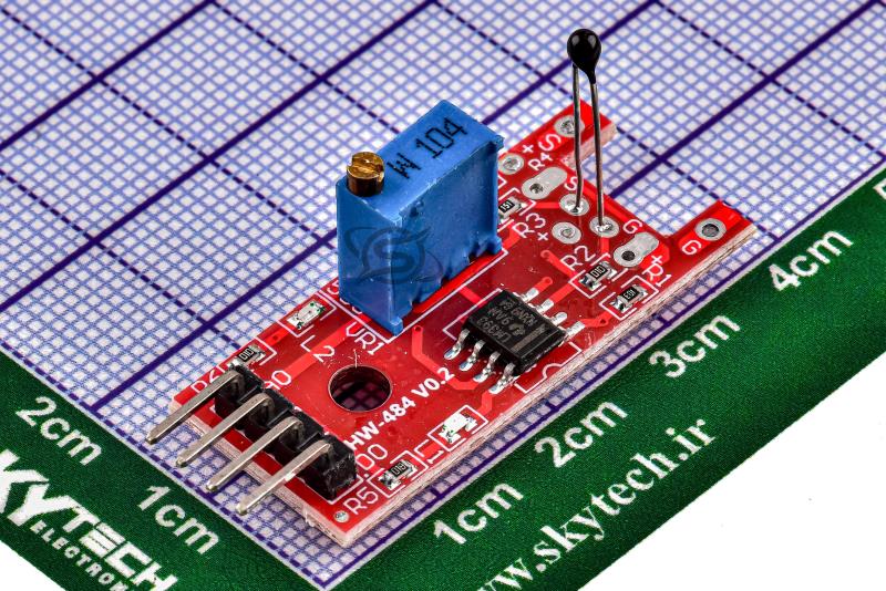 Digital temperature sensor module that measures temperature changes based on thermistor resistance. The module has both digital and analog outputs. It contains a thermistor sensor that measures the ambient temperature. The resistance of the thermistor varies inversely with temperature