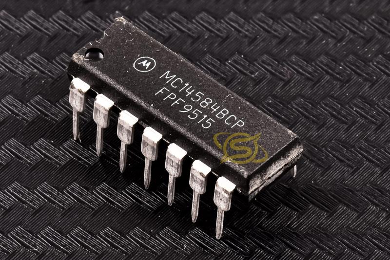 MC14584B Hex Schmitt Trigger با دستگاههاي MOS P-channel و N-channel mode در يک ساختار يکپارچه ساخته شده است. اين دستگاهها در مواردي که اتلاف انرژي کم و/يا مصونيت نويز بالا مورد نظر است، کاربرد اصلي را پيدا ميکنند. MC14584B را مي توان به جاي اينورتر شش گوش MC14069UB براي افزايش ايمني نويز براي "مربع کردن" شکل موج هاي آهسته در حال تغيير استفاده کرد.